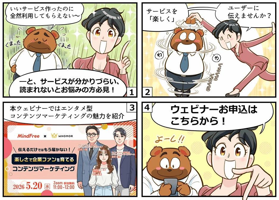 本ウェビナーでは、ゲームなどの体験型コンテンツを活用したマーケティングを手掛けるマインドフリー株式会社と、漫画を活用したコンテンツ制作を行う株式会社フーモアの2社が、それぞれの事例や取り組みを交えながらお話しします。